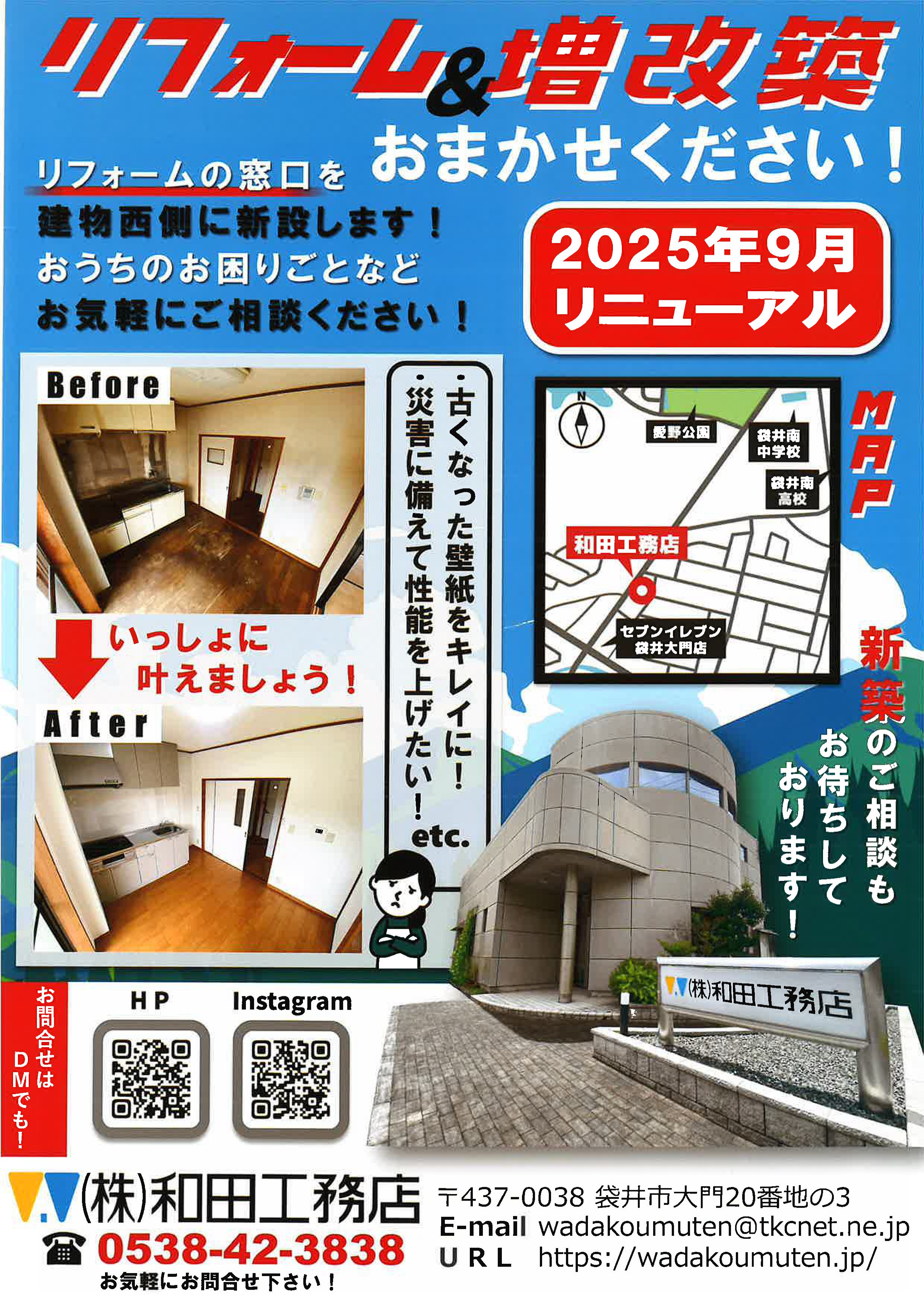 | 事務所リニューアルのお知らせ 2025年9月 弊社建物西側にリフォームの窓口を新設致します!! お家のリフォーム・増改築・外構工事などお家のお困りごとお気軽にご相談ください! 新築のご相談もお待ちしております! | →詳細 |